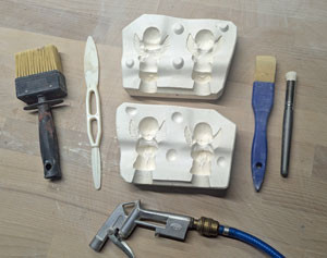1.) Zuerst reinigen wir die Gips-Gussform vorsichtig mit Pressluft und entfernen evtl. Rückstände eines vorhergehenden Gusses. Dabei kann auch ein weicher Pinsel hilfreich sein. Auf dem Bild links sieht man ds Werkzeug, welches ich zum reinigen der Formen verwende. Es ist darauf zu achten, dass die Fläche der Form, die das spätere Stück abbildet nicht beschädigt oder verkratzt wird. Wir verwenden daher erst Pressluft (evtl. mit einem Pinsel oder Schaumstoff-Pinsel die Reinigung unterstützen) um die Formteile auszublasen und danach einen leicht angefeuchteten, weichen Schwamm mit etwas Wasser um wirklich alle Unreinheiten möglichst zu beseitigen. Auch die Auflageflächen der Formstücke, die später aufeinander liegen werden gesäubert, damit die Form sauber schließt und sich eine möglichst geringe Gussnaht bildet.