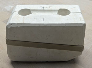 2.) Nach dem reinigen wird die Form mit Gummis so geschlossen, dass die Formteile richtig fest aneinandergedrückt werden und sich keine Lücke ergibt, aus der der flüssige Ton laufen könnte. Sollte das doch einmal passieren, ist der Guss natürlich fehlgeschlagen und man kann an dieser Stelle abbrechen. Nach dem Schließen der Gussform muss strikt darauf geachtet werden, dass nun nichts mehr, und sei es noch so klein, in die Form fällt. Das würde sich später auf dem Stück abzeichnen.