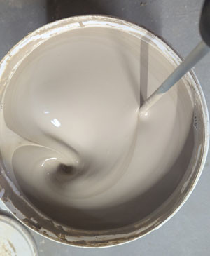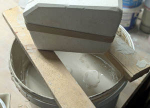 3.) Ich verwenden zum Keramik gießen fertige Steinzeug Gießmasse. Bei einem neuen Eimer ist dieser in der Regel gussfertig eingestellt und muss nur ordentlich aufgerührt werden. Sind bereits einige Güsse erfolgt und die Reste wurden immer in den Eimer zurück gefüllt, dann kann es auch sein, das man mit etwas Wasser wieder die ursprüngliche cremige Eigenschaft hergestellt werden muss, da dem Ton bei trocknen in der Form natürlich Wasser entzogen wird. Auch kann dann ein spezielles Stellmittel notwendig werden, damit der Gusston sich nicht zu schnell absetzt, was zu unschönen Ringen am fertigen Stück führt.