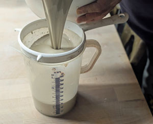 4.) Wir füllen nun die Gießmasse, nachdem wir diese gut aufgerührt haben, durch ein Sieb in ein entsprechendes Gussgefäß, hier ein 2 Liter Becher mit Auslauf. Die Größe des Gefäßes richtet sich natürlich nach der Größe der Form. Sie sollte so groß gewählt sein, das die Form in einem Zug komplett gefüllt werden kann, da sich sonst unschöne Ränder am gegossenen Stück bilden können. Durch das Sieben werden grobe Teile vor dem Gießen ausgefiltert und nur wirklich feine Ton Masse wird zum Gießen verwendet. Kleine Stücke im Ton wäre sonst später evtl. an der Außenseite des Stückes sichtbar. Manche verwenden auch Schöpfkellen zum füllen der Form. Ich persönlich empfehle aber einen entsprechenden Becher, damit man in jeden Fall auf einmal und ohne Unterbrechung durchgießen kann.