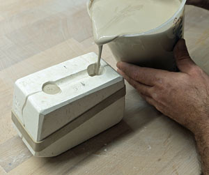 5.) Nun gießen wir den Ton in die vorbereitete Form. Dabei achten wir darauf, den Ton langsam und gleichmäßig in die Form zu füllen, damit dieser in jede kleine Ecke der Form laufen kann und keine Lufteinschlüsse entstehen. Lufteinschlüsse können ein Stück unbrauchbar machen oder im ungünstigsten Fall im Ofen dann zum Platzen des Stückes führen.