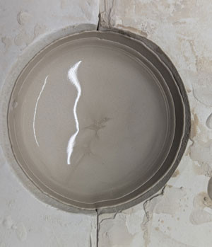 6.) In der Regel befindet sich ein Gießkegel in jeder Form. Dieser sorgt dafür, dass etwas mehr Ton eingefüllt werden kann, als für das eigentliche Stück benötigt wird. Wir füllen bei großen Stücken, während wir auf die Trocknung des Stückes warten, immer mal wieder diesen Gießkegel mit etwas Giesston auf. Auch kann man an diesem Kegel erkennen, wie dick die Wandstärke des Stückes ist. Es dauert je nach Größe etwas, bis die gewünschte Wandstärke erreicht worden ist. Bei kleinen Gegenständen, wie z.B. Bienen dauert es nur wenige Minuten, bei größeren Stücken kann es schon mal 15-20 Minuten dauern, bis die Wandstärke erreicht ist. Hier ist auch etwas Gefühl gefragt, dass man aber schnell entwickelt.